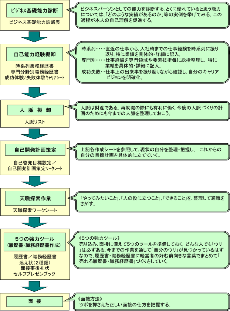 白根陸夫が独自開発した「再就職支援サービス」では「自分の”ウリ”の見つけ方と売り込み方法」をつぎのフローで構成しています。