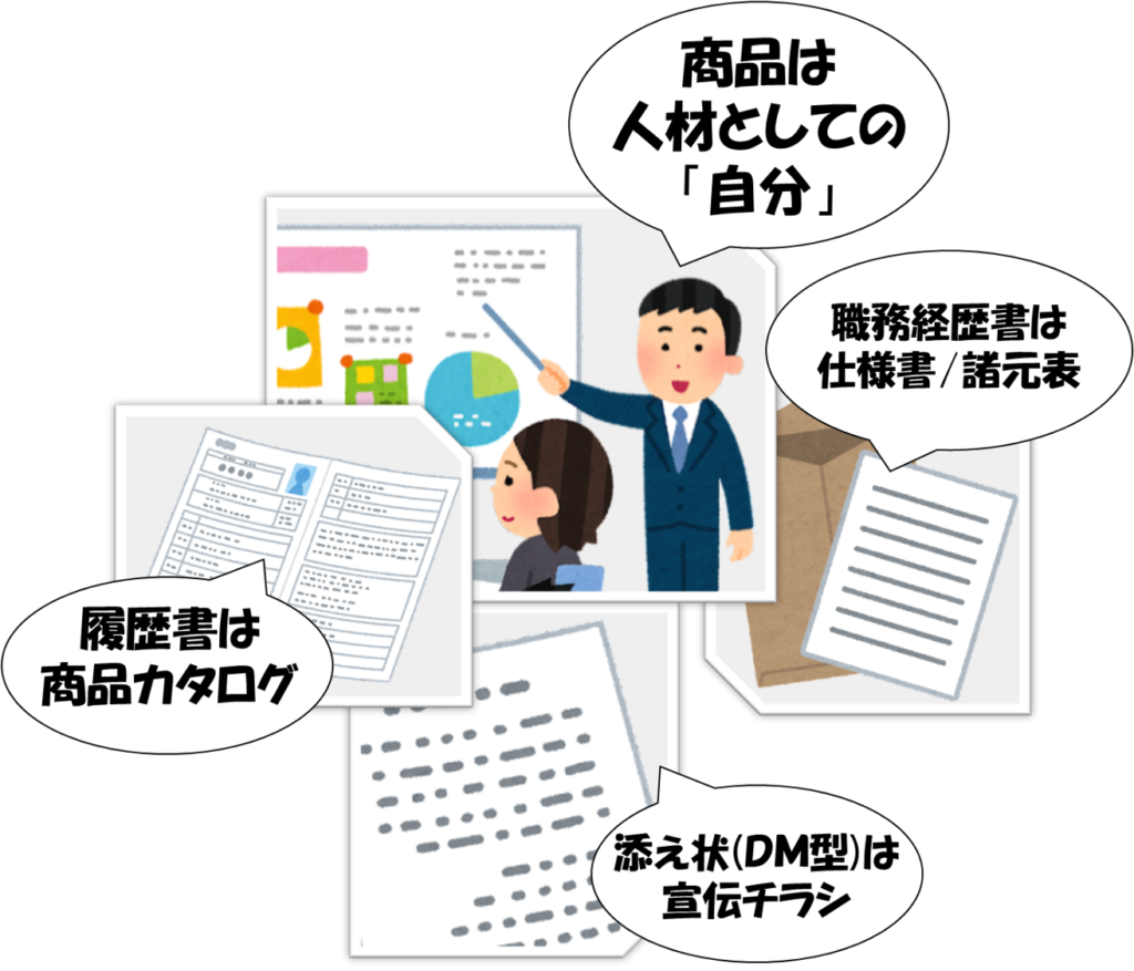 応募者(自分)対採用者(社長)、売込み者(自分)対見込み客(社長)をつなぐツールが「履歴書/職務経歴書」や「事業案内」です。