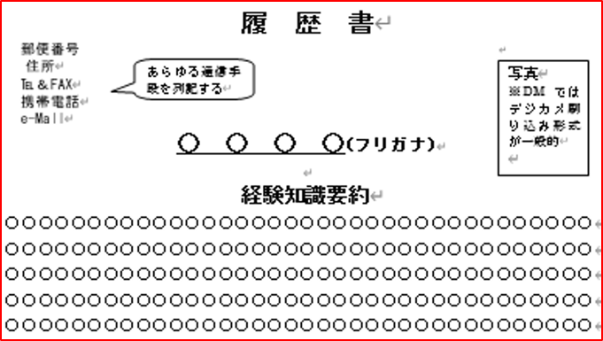 その重要なファクターの一つが、「履歴書」であり、その「履歴書」の記載事項の中で最も大切なセールスポイントが「経験・知識要約」である。新卒採用ではなく途中入社(転職)の場合には、どのようなキャリアをつみ、何ができるかをうまくアピールできた者が勝利者。