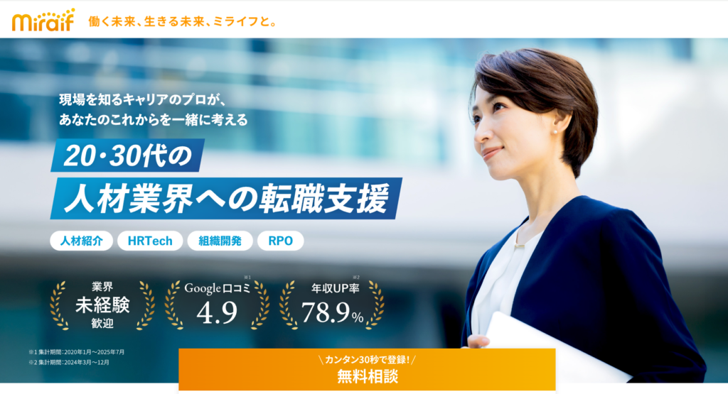 ミライフは、人材業界への転職支援に特化した転職エージェントです。HRTech企業や人材紹介会社、RPO企業などの求人を中心に取り扱っています。