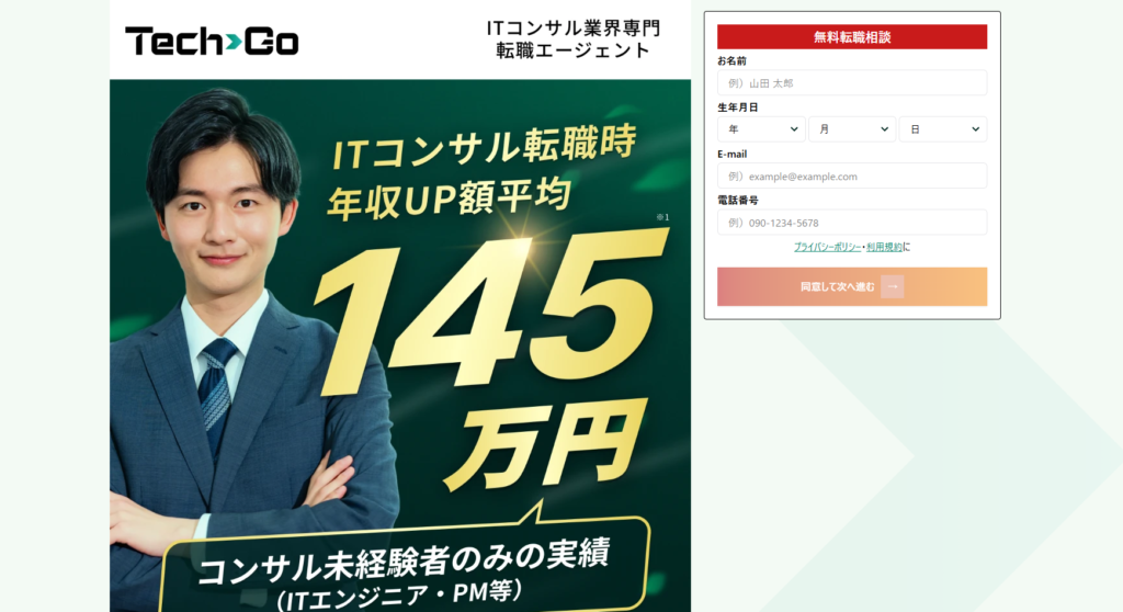 TechGo(テックゴー)は、ITエンジニアの年収アップや上流工程へのキャリア移行を目的とした転職支援サービスです。