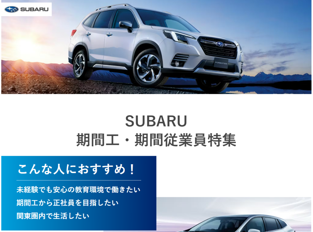 | スバル | 稼ぎたい人向け | 時給が高く収入強 | 登用はやや狭き門 | 完成車でかなりハード | 寮費無料で安心 | 体力に自信が必要 |