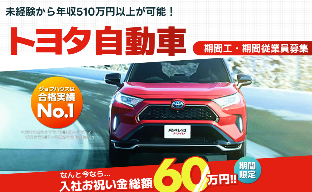 現在、トヨタ期間工では最大60万円の入社祝い金が用意されているタイミングでもあり、条件を満たせばまとまった資金を早期に確保することが可能です。こうした特典は時期によって変動するため、最新情報を把握している紹介会社を通すことで取りこぼしを防げます。