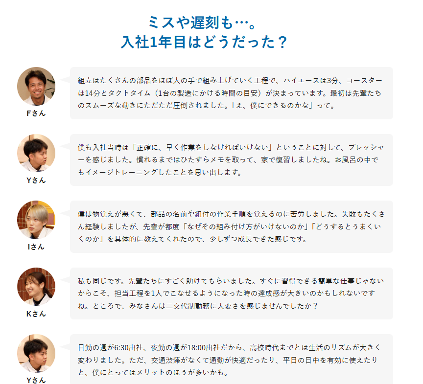 岐阜車体はトヨタ系の工場であり、安全管理や作業ルールが非常に厳格です。ライン作業の精度が求められ、曖昧な動きや自己流は許されません。