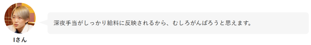 ただし、その分だけ残業代や深夜手当が付き、収入は比較的安定します。ここをメリットと見るか、デメリットと見るかで評価は大きく分かれます。