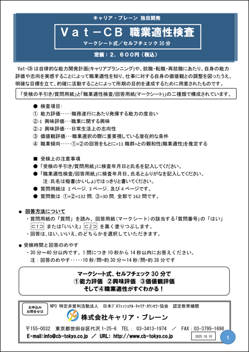 Vat-CB職業適性検査は、自律的な能力開発計画(キャリアプランニング)や、就職・転職・再就職にあたり、自身の能力評価や志向を実感することによって職業適性を知り、仕事に対する自身の価値観との調整を図ったうえ、明確な目標を立て、的確に活動することによって所期の目的を達成するために用意されたものです。