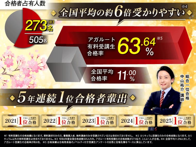 アガルートの最大の強みは、2024年度の受講生合格率63.64%という圧倒的な実績です。全国平均合格率11.00%の約5.8倍にあたり、5年連続で全国1位合格者を輩出しています。合格時には全額返金またはAmazonギフト券5万円の特典が用意されており、高額な受講料に対するリスクを軽減できる点も大きな魅力です。