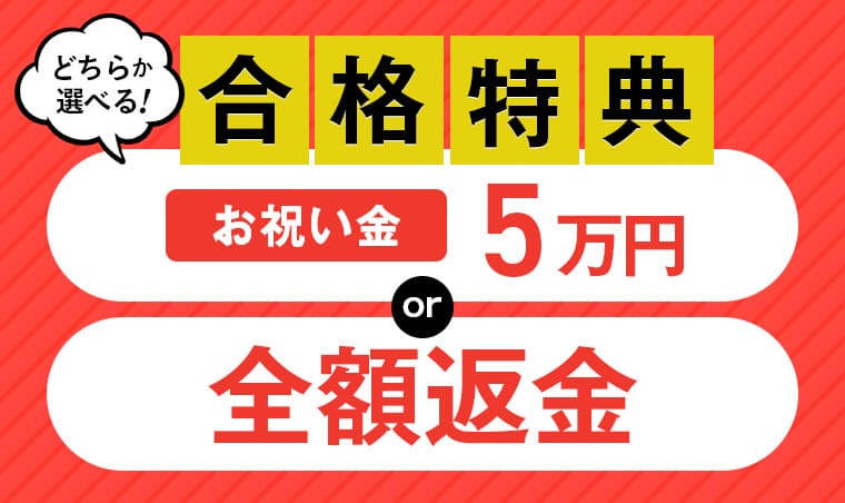 合格率63.64% (2024年度) は全国平均の約5.8倍。 - 合格時には全額返金 (税抜) またはAmazonギフト券5万円の合格特典も選択可能