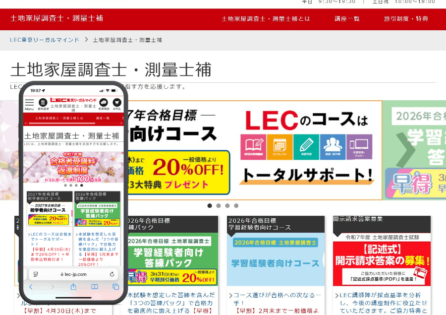 | 2027年 | ダブル合格カリキュラム/フル | 492,800円 | 初学者 | 土地家屋調査士+測量士補のセット。質問70回。午前の部免除を同時に取得できる |
