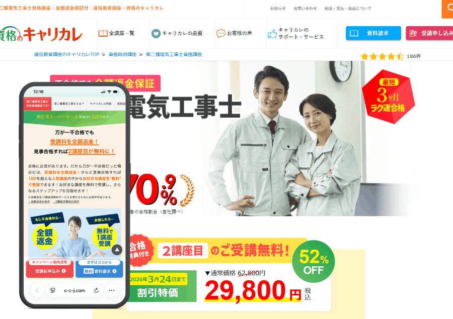 2位キャリカレ86点 / 100点不合格時全額返金保証・質問無制限・合格で2講座目無料