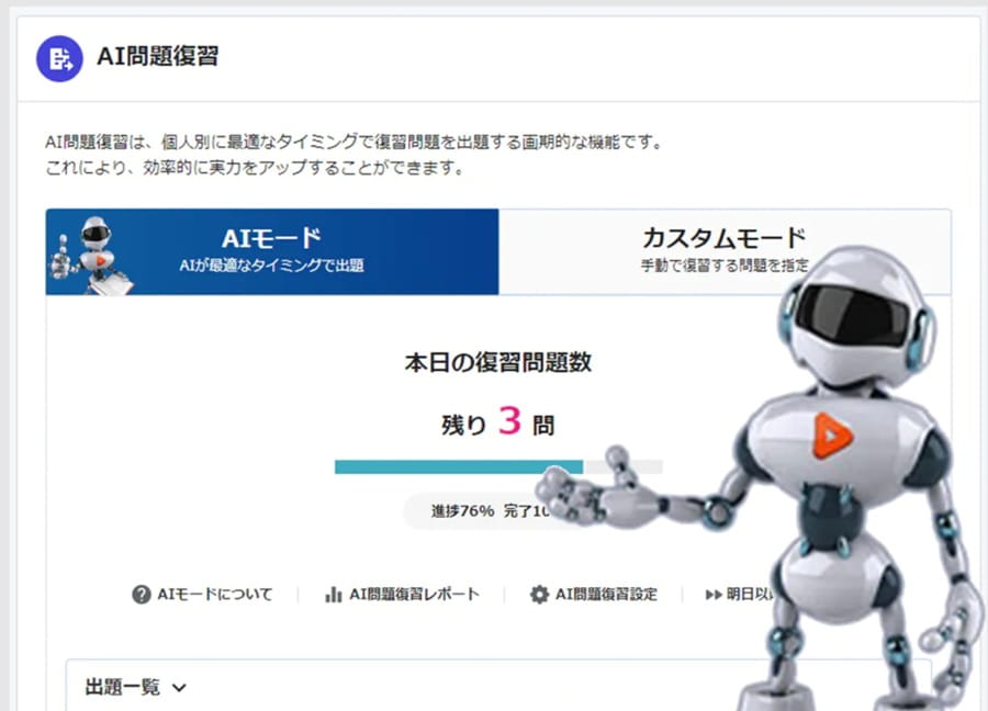 AI問題復習機能が便利。自分の苦手な分野を自動で出題してくれるので、効率よく弱点を克服できました