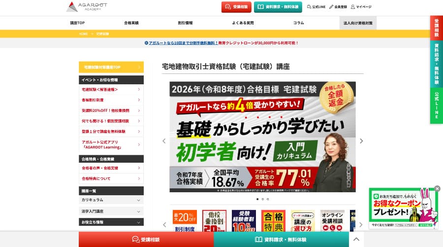 | アガルート | 合格率77.01% / 合格時全額返金 or お祝い金 |