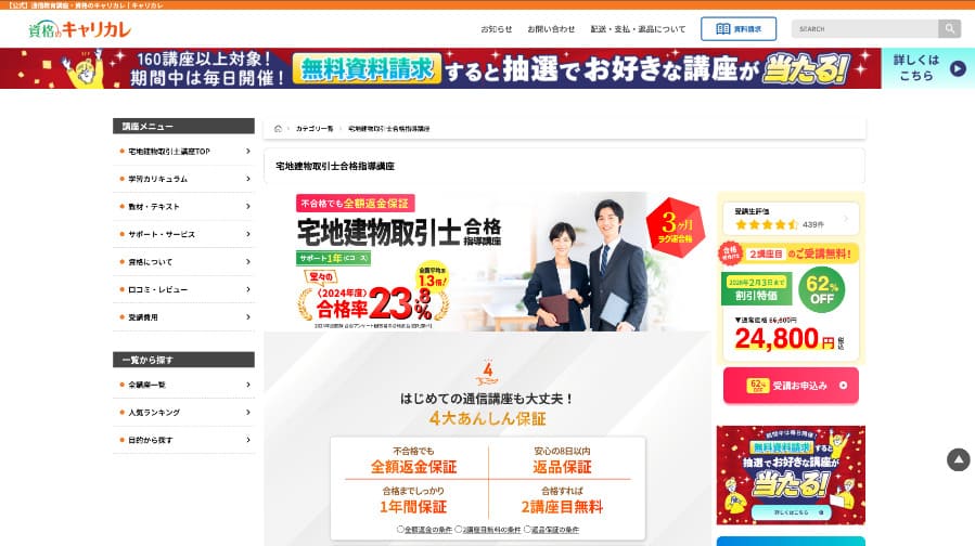 ![]() ![]() 公式サイト | (3.3) | 66,800円 | 合格率23.8% (2024年度) | 不合格時返金保証・合格で2講座目無料 | 質問無制限 / 添削あり |
