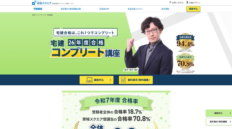 ![]() ![]() 公式サイト | (3.1) | 66,000円~77,000円 | 合格率70.8% (2025年度) | オンライン専業・攻略クエストで演習 | 質問100回 / 月1回Zoom相談 |