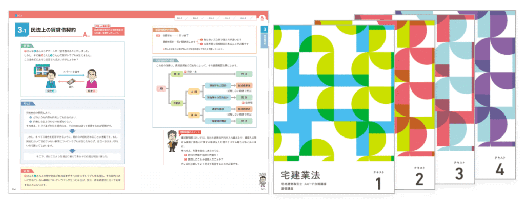 宅建講座では、合格に必要な範囲に絞った「合格点主義」のカリキュラムを採用しており、限られた学習時間でも効率よく合格を目指せます。テキストはフルカラーで図表やイラストが豊富なため、法律用語に馴染みのない初学者でも視覚的に理解しやすい設計です。